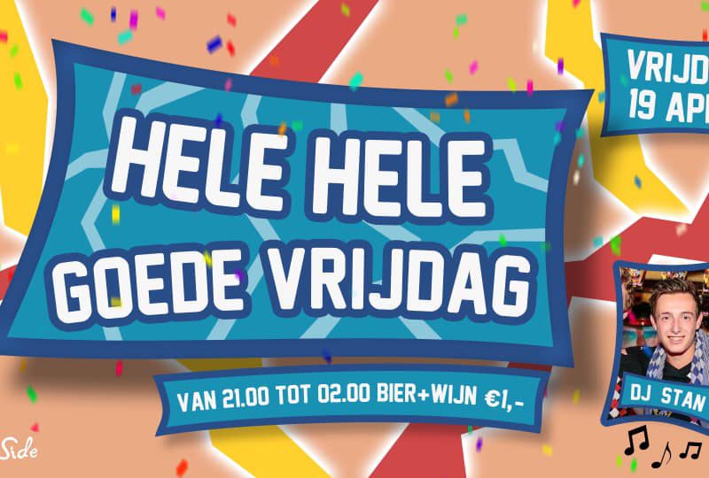Hele Hele Goede Vrijdag Wat je moet weten Van de Goede Vrijdag gaan we een Hele Hele Goede Vrijdag maken! Biertjes en Wijntjes voor maar €1,- Lekkerste plaatjes van DJ Stan Datum: 19 April 2019 Tijd: 19:00 - 03:00 Entree: gratis Deel dit evenement met je vrienden