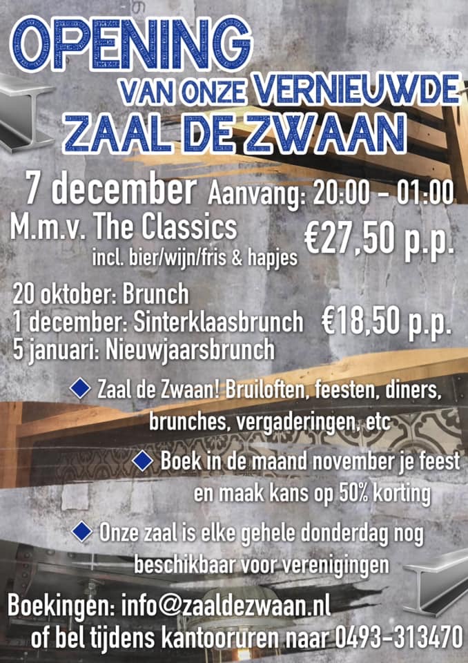 Opening vernieuwde Zaal de Zwaan met The Classics Wat je moet weten Datum: 7 December 2019 Tijd: 20:00 - 01:00 Deel dit evenement met je vrienden