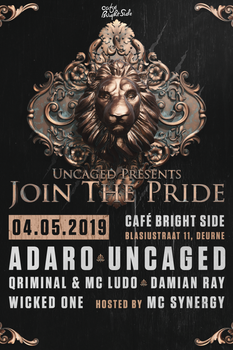 Wat je moet weten DJ Uncaged presents Join The Pride! Kneiter hard feestje met: DJ Adaro, Uncaged, Qriminal & MC Ludo, Wicked One, Damian Ray, MC Synergy Datum: 4 May 2019 Tijd: 21:00 - 03:30 Deel dit evenement met je vrienden
